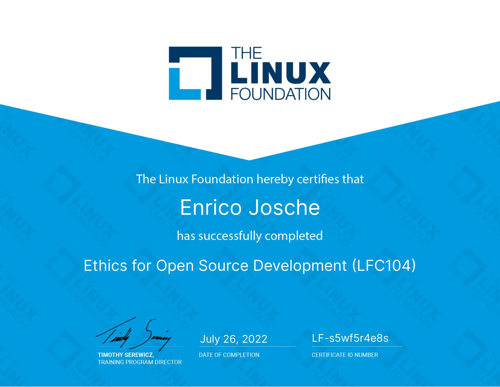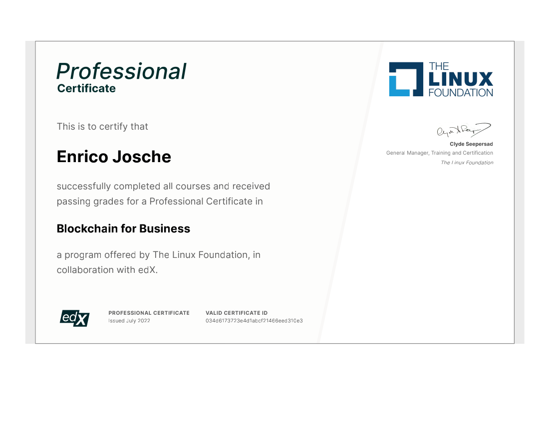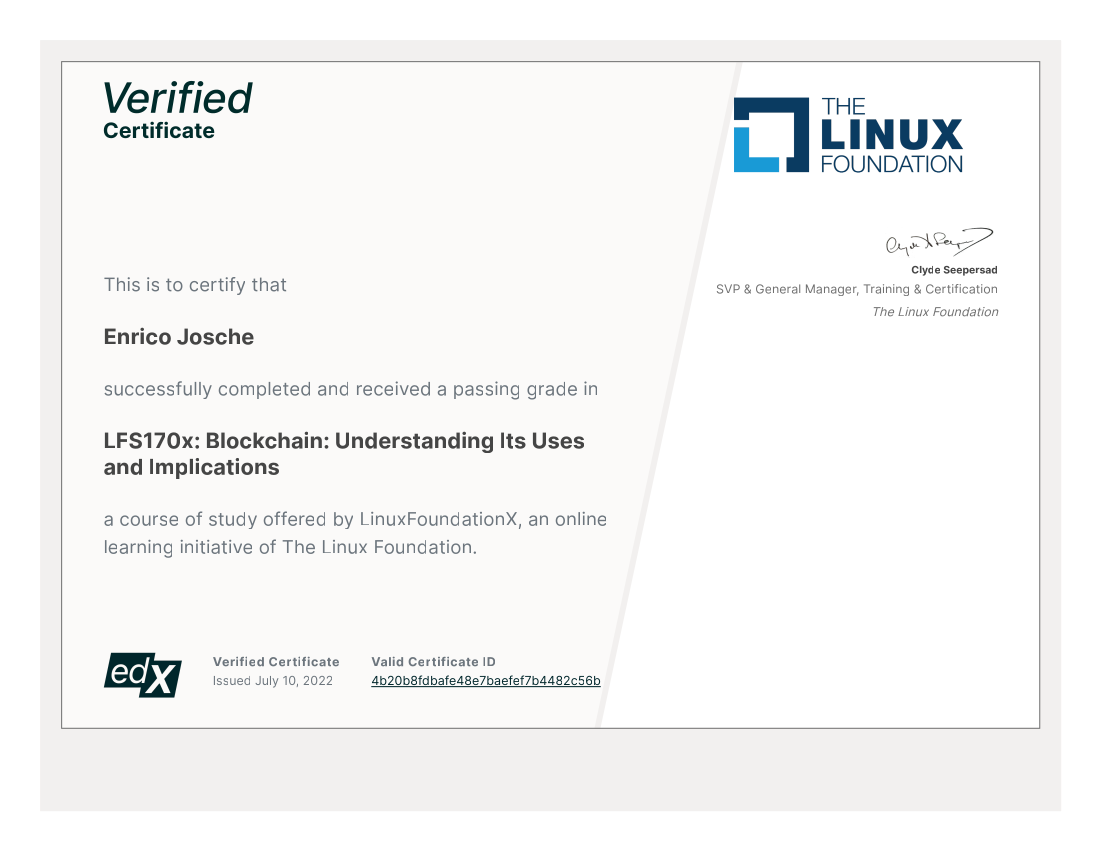 Bitcoin for Everybody, Saylor Academy Bitcoin for Developers I, Saylor Academy Bitcoin for Developers II, Saylor Academy (ongoing) Principles of Austrian Economics I, Saylor Academy (ongoing) Ethics for open Source Development, The Linux Foundation Introduction to Digital Currencies, University of Nicosia Blockchain: Understanding the Uses and Implications, The Linux Foundation Blockchain for Business, The Linux Foundation Introduction to Hyperledger Blockchain Technologies, The Linux Foundation btcPrague – The biggest Bitcoin event in Europe, 2023 PoW Summit 2024, Frankfurt am Main Frankfurt School: Bitcoin Talents 2024 – abgebrochen, da Bitcoin-in-name-only; Präsentation: Bitcoin Burg 2024 – PILLORANGEBLACK: Free and Open Source Software Arte Diskussion: „Bitcoin – Digitales Gold?“, Frankfurt am Main, 4. Februar 2025